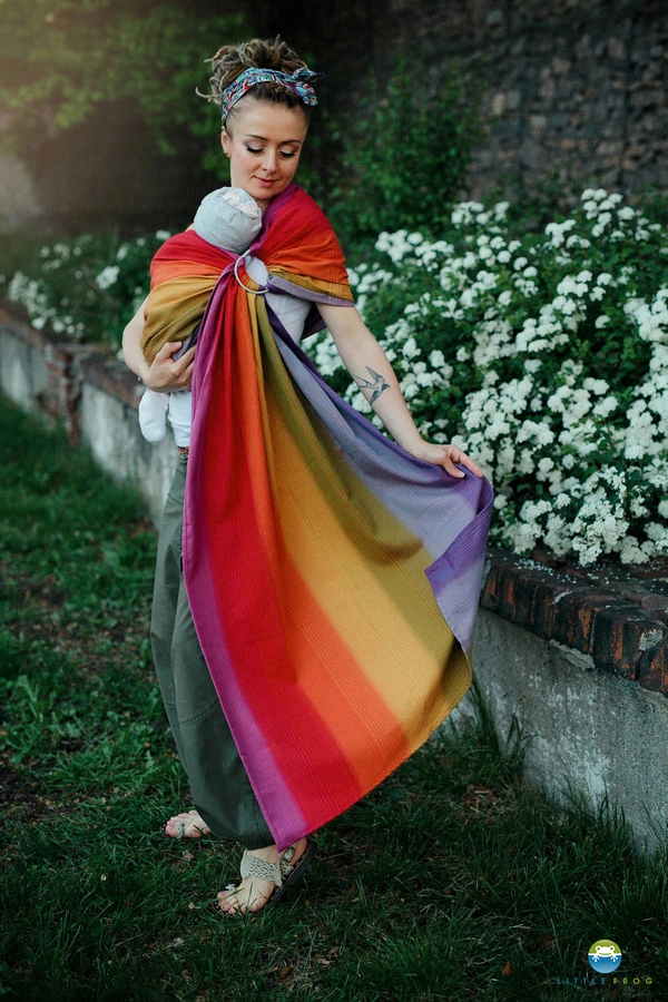 TAGI: noszenie dziecka, noszenie w chuście kółkowej, chusta kółkowa, chusta kółkowa dla niemowlaka, wyprawka dla noworodka, prezent dla noworodka, tęczowa chusta kółkowa, chusta ze splotem skośno-krzyżowym, splot skośno-krzyżowy, chusta tkana, chusta wiązana