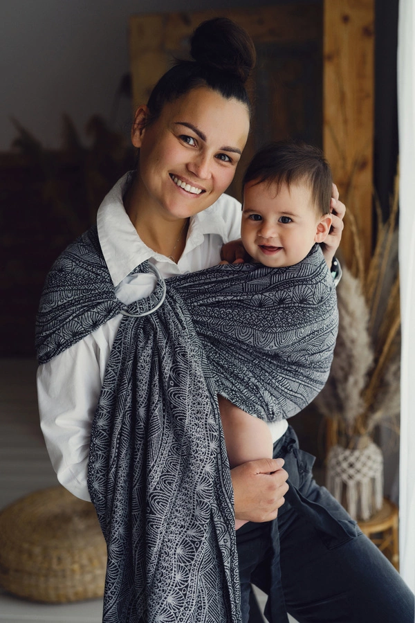 TAGI: noszenie dziecka, prezent dla noworodka, noszenie w chuście kółkowej, chusta kółkowa, chusta kółkowa dla niemowlaka, wyprawka dla noworodka, prezent dla noworodka, żakardowa chusta kółkowa, chusta ze splotem żakardowym, splot żakardowy, chusta tkana, chusta wiązana