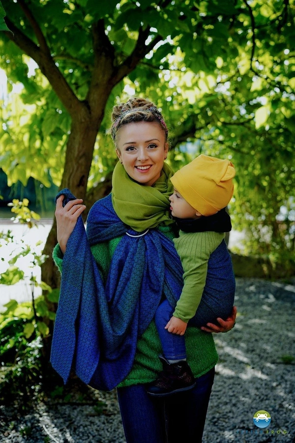 TAGI: noszenie dziecka,, noszenie w chuście kółkowej, chusta kółkowa, chusta kółkowa dla starszaka, wyprawka dla noworodka, chusta kółkowa ze splotem serduszkowym, niebieska chusta ze splotem serduszkowym, splot serduszkowy, chusta tkana, chusta wiązana